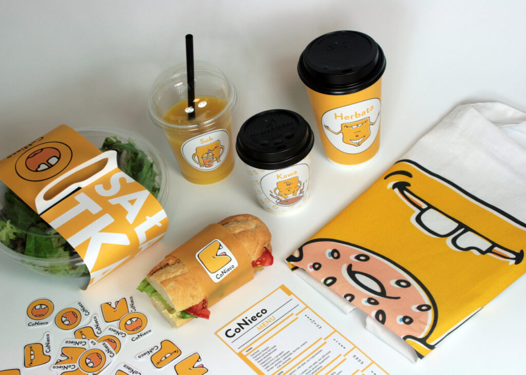 „CoNieco” to projekt identyfikacji wizualnej kawiarni i sandwich baru w jednym. Celem tego miejsca jest serwowanie świeżych i zdrowych posiłków od rana do pory lunchu. W związku z tym, przedstawiona identyfikacja oparta jest na kolorach jasnych, ciepłych, kojarzących się z porankiem i energią. Logo składa się z nazwy kawiarni oraz 3 alternatywnych znaków. Każdy z nich może być używany wymiennie, ponieważ elementem scalającym identyfikację jest kolor oraz postać maskotki kawiarni – Fred.