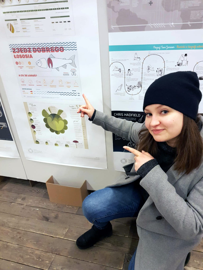 Infografika „Zjedz dobrego łososia” pojawiła się na wystawie Pedagogów i Studentów Katedry Komunikacji Wizualnej Uniwersytetu Artystycznego w Poznaniu, zatytułowanej „Podtekst”.